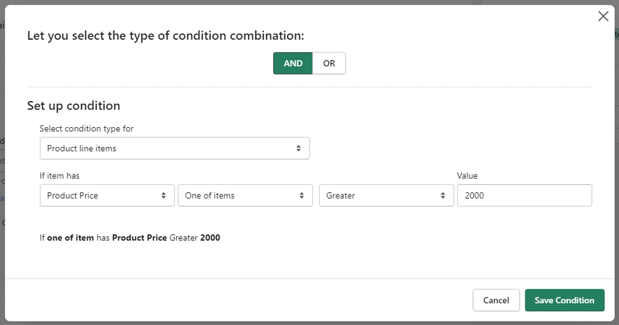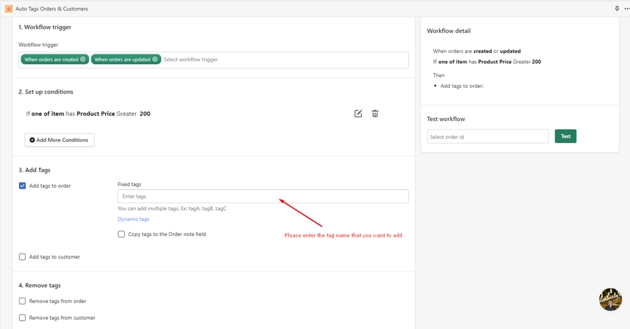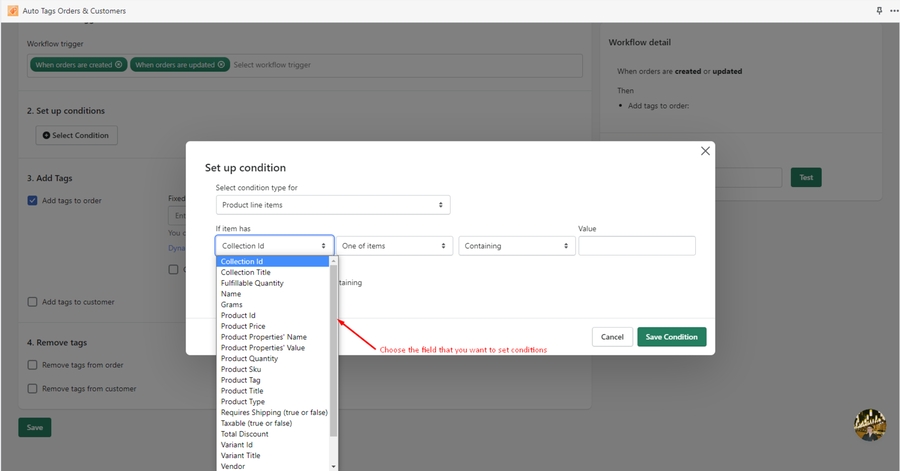 Type in the item’s value you want, then chooses if the item contains, starts with, equals, etc… to match with that value. For example, if you want to tag orders that have at least 1 item whose price is greater than 2000$, here’s how you set it up: