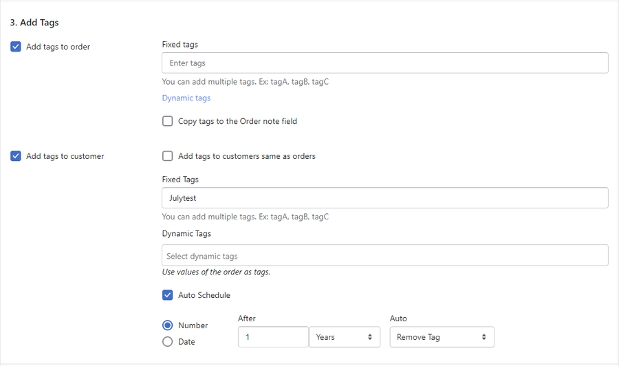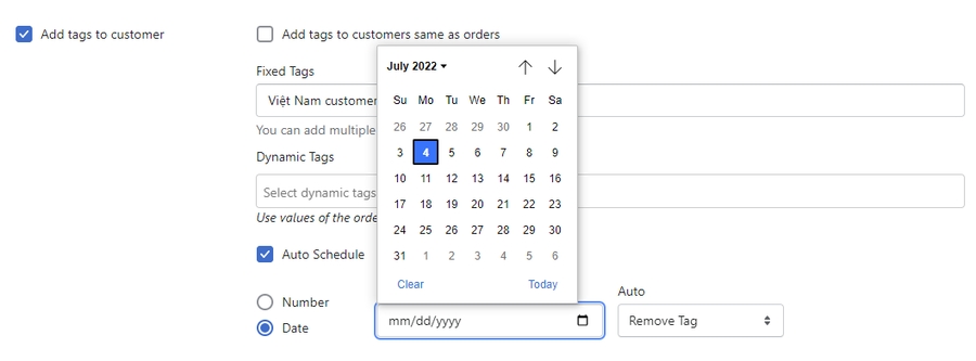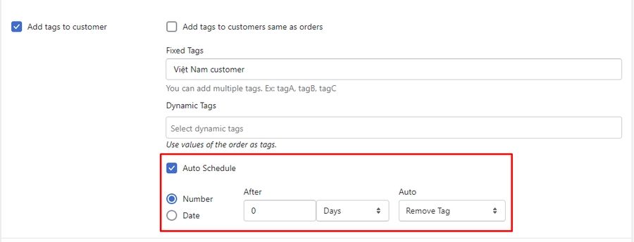Note: Auto Schedule is a special feature for Customer Tag only, and is used to set the expiry date for a tag or to update a tag after a period: