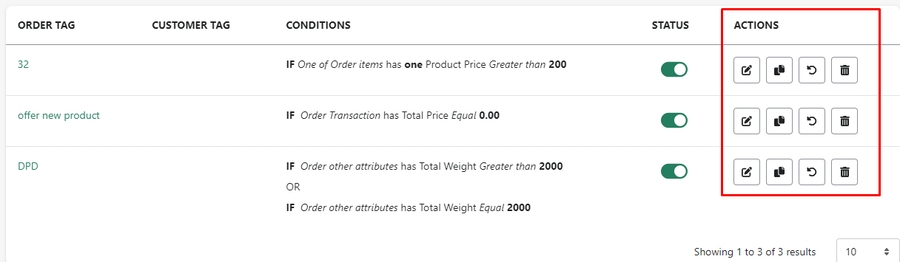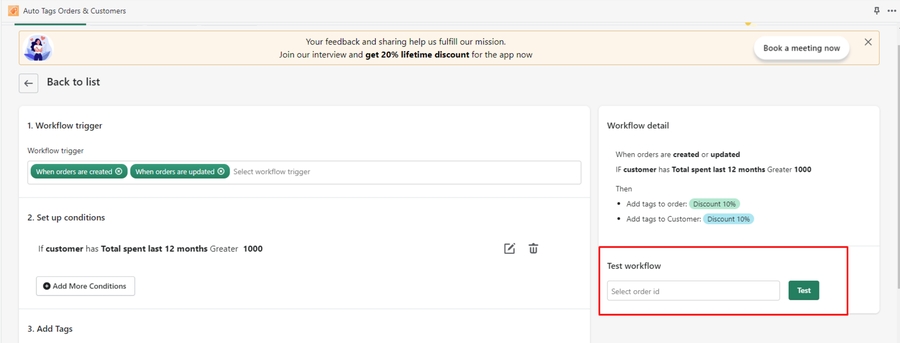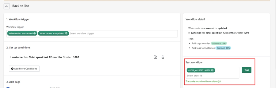 Want to check if the tag you are about to add will be exactly as you need? Use our Test workflowtool on the right side of the screen to check your previous orders. Please note that the test just checks the conditions only.