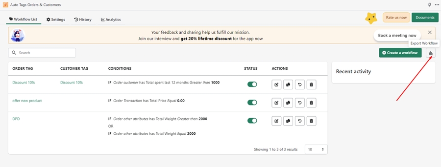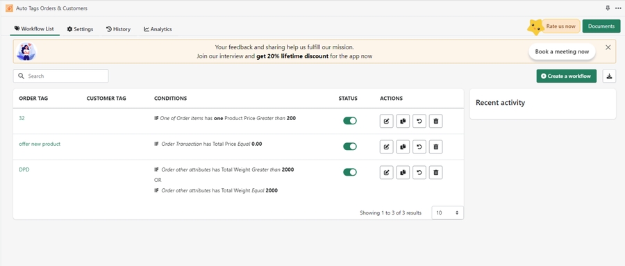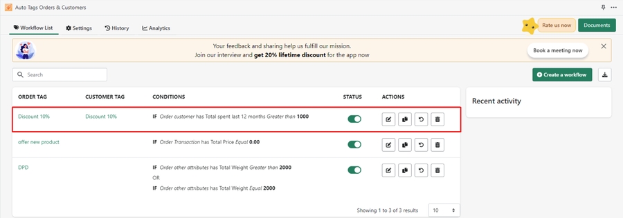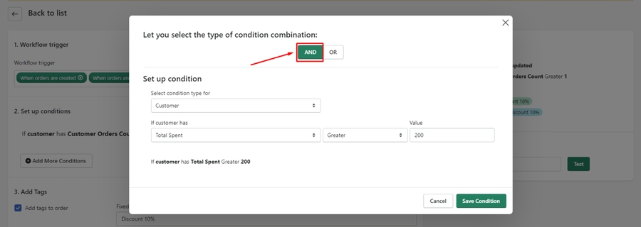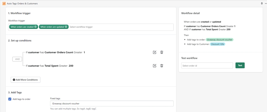 For example, you want to tag any orders and customers that meet 2 conditions: customers bought more than 1 order AND the total that customer spent is more than 200$, with the name Giveaway discount voucher