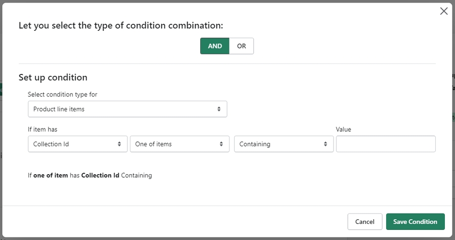 If you add more than 1 condition for a tag, then the order will need to satisfy all the conditions you set for that tag to get tagged.