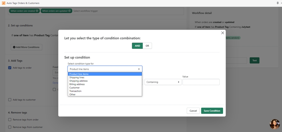Besides, you could also create a tag for both order and customer by creating the conditions as normal and choosing both.