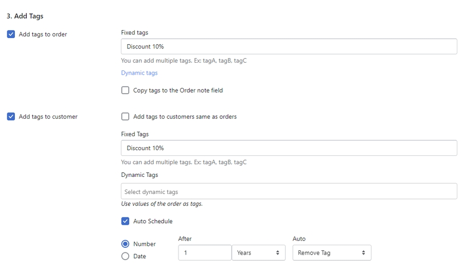 For example, if you want to give customers whose total spent in a year has reached 1000$ on your store a private special discount of 10% for the next year, so they will feel that you truly care about your customers, then just create a tag for customer with the relevant condition and set the Auto Schedule for 1 year.