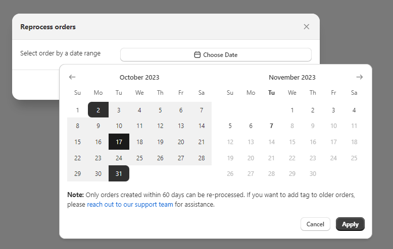 * Reprocess within a date range: Pick a duration you want to add tags to your orders. Remember to update your app permission so we can tag to your all orders.