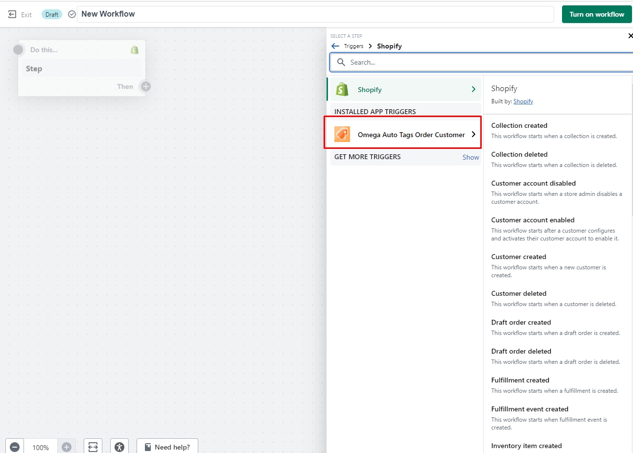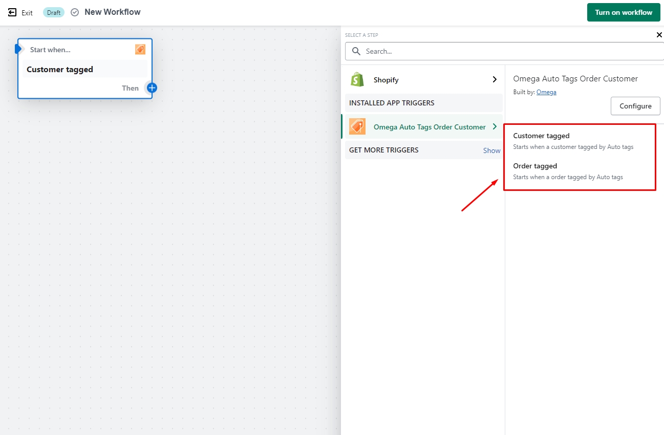 In Shopify Flow admin app -> Create a new workflow -> Then Select Trigger -> Then pick Omega Auto Tags for Trigger.