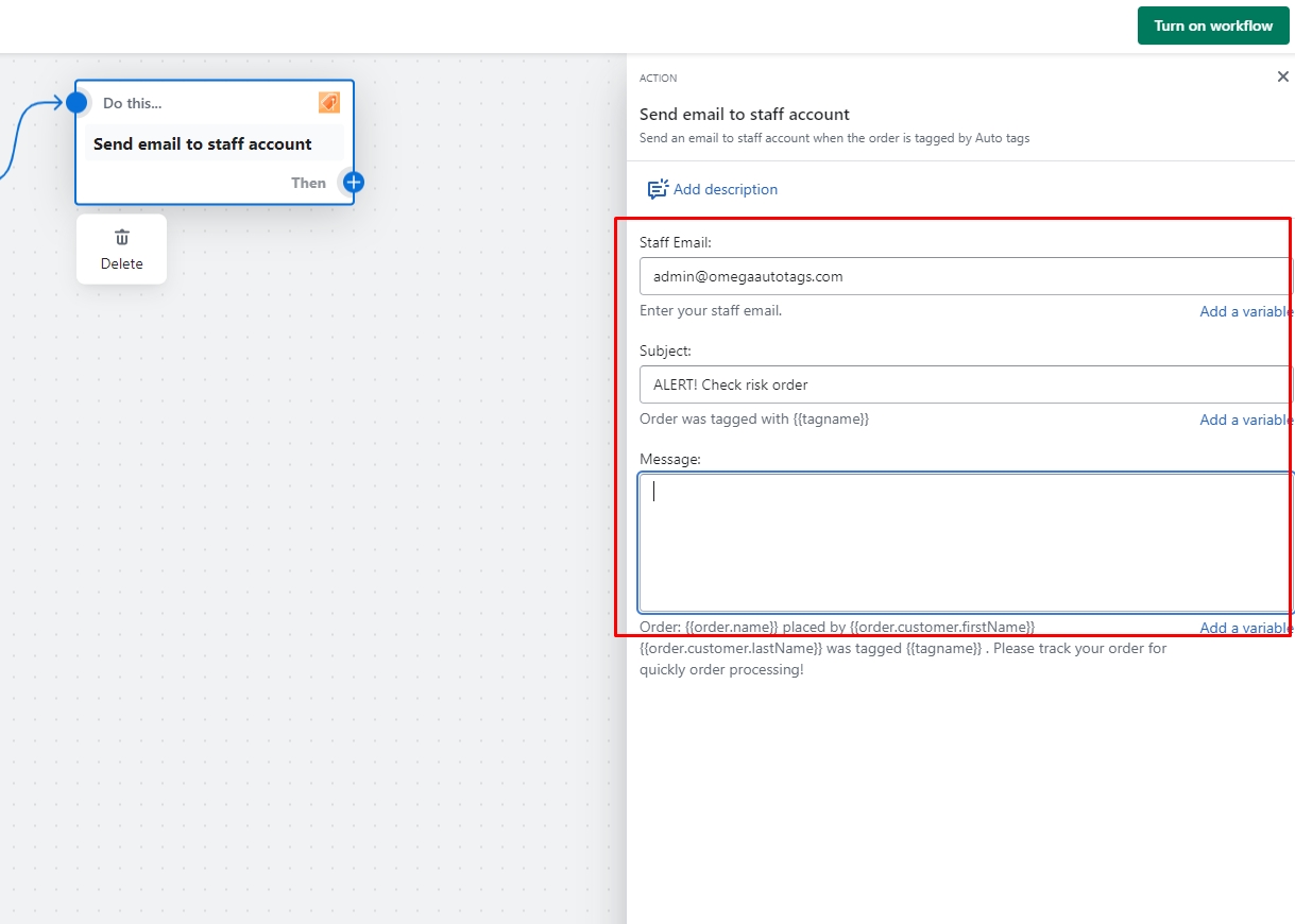 If you already tag your orders which is highly risky in Omega AutoTags. Now you want to send email to your staff and set time for them to check if it's a scam order.