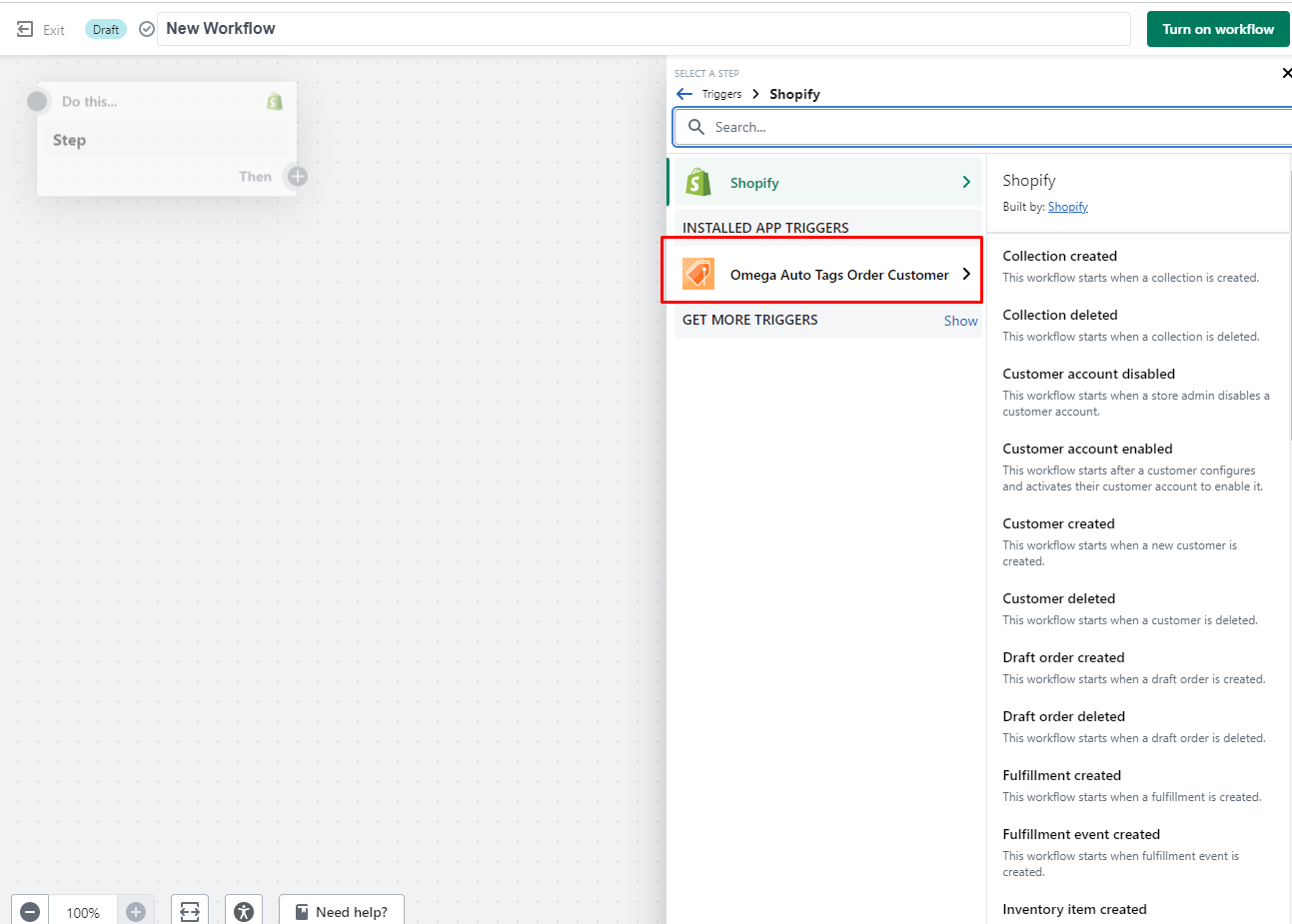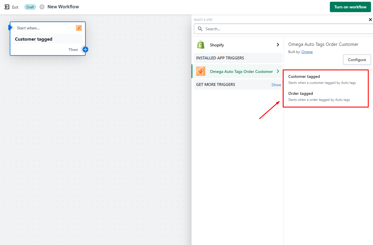 In Shopify Flow admin app -> Create a new workflow -> Then Select Trigger -> Then pick Omega Auto Tags for Trigger.&#x20;
