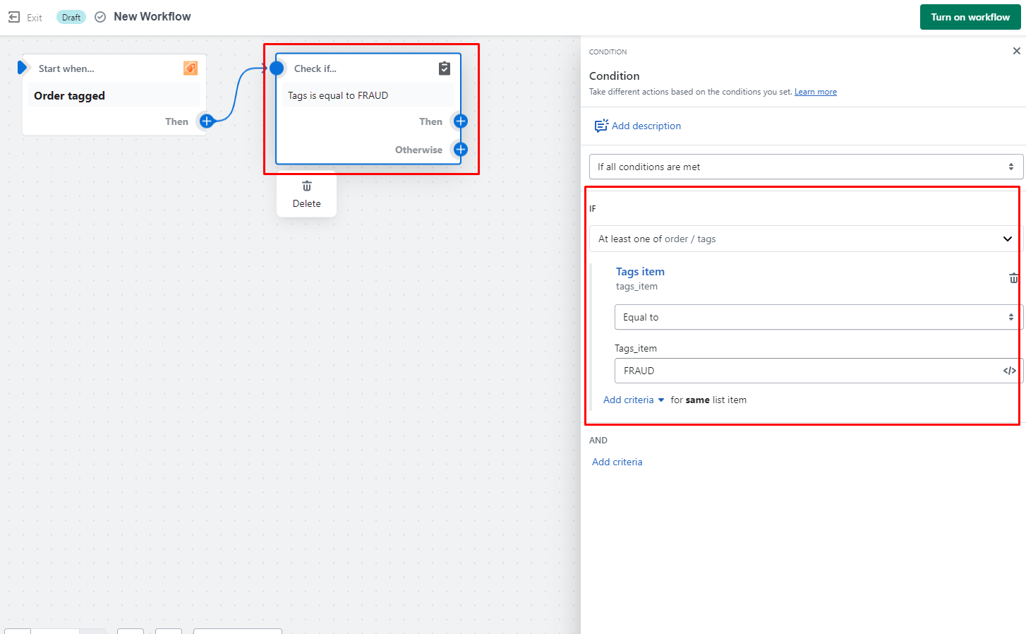 Set Condition. Check if the tag of the order equals to order you set in Omega AutoTags: FRAUD (in this case).