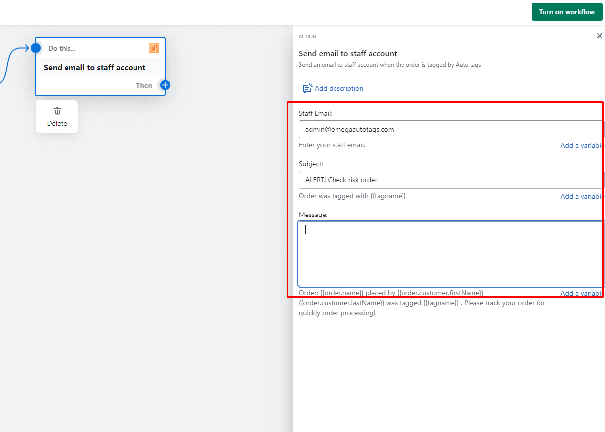 If you already[ tag your orders](https://autotags-omega.gitbook.io/auto-tags-documents/main-features/add-tag-to-a-customer) which is highly risky in Omega AutoTags. Now you want to send email to your staff and set time for them to check if it's a scam order.&#x20;