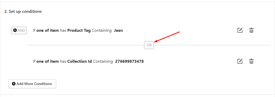 If you add more than 1 condition for a tag, then the order will need to satisfy all the conditions you set for that tag to get tagged.